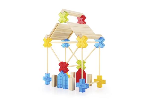 100-delige set met constructiemateriaal (plastic staven, houten planken en connectoren)