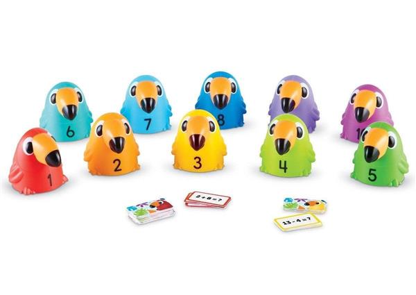 Deze kleurrijkte toekan activiteitenset ontwikkelt een verscheidenheid aan wiskundige vaardigheden. Naast getalherkenning (1 t.e.m. 10) kan ook het tellen, optellen en aftrekken ingeoefend worden.Ook het aanleren van sorteer- en patroonvaardigheden kan met deze set.