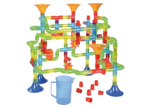 Laat je fantasie de vrije loop en bouw een transparante waterweg. Giet met de transparante beker water in de trechters en bekijk welke weg het water zal afleggen. Ook kan dit natuurlijk gespeeld worden met een kleine knikker. Ongetwijfeld veel plezier met deze waterweg.
