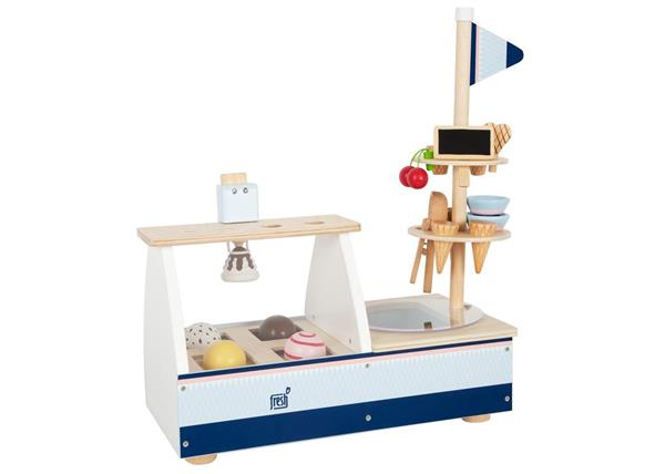 Met deze houten verkoopstand verkoop je in een mum van tijd tal van overheerlijke ijsjes. Op deze manier wordt taal en samenspel bevorderd als ook eenvoudige wiskundige bewerkingen tijdens het kopen en verkopen van de ijsjes. De set bevat tal van mogelijkheden om de ijsjes helemaal naar wens te kunnen maken. Pak de bollen op met de ijsschep en plaats ze in één van de potjes of hoorntjes. Versier de ijsjes naar wens met een kers of koekje. De onderdelen blijven met behulp van magneetjes mooi aan elkaar hangen. Geef met het krijtbordje aan of de winkel open of gesloten is of hoeveel de ijsjes kosten. Enkel op bestelling.