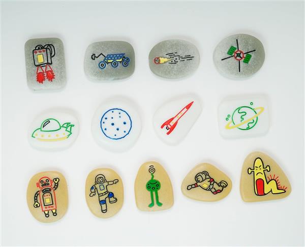 set van 13 verschillende vertelstenen in het thema ruimte (afm. grootste 5 x 5 cm)