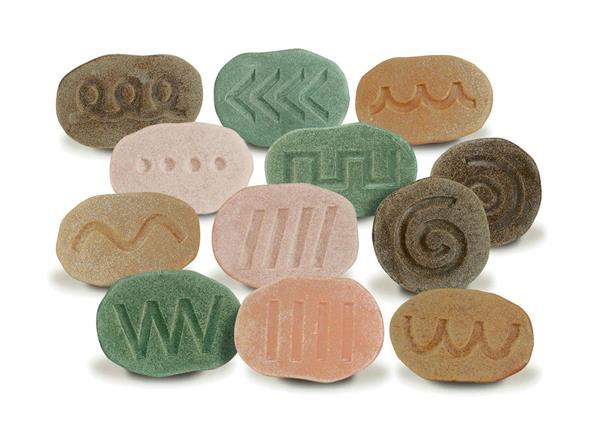 Deze tactiele stenen zijn zeer geschikt voor voorbereidende schrijfactiviteiten. Ze helpen kinderen hun fijne motoriek te oefenen. Ook kunnen met deze stenen afdrukken in klei en deeg gemaakt worden. Elke steen is gegoten uit een speciale mix van steen en hars en gegraveerd met een patroon. Deze duurzame weerbestendige kiezelstenen zijn zeer geschikt voor gebruik in het zand, water en buiten. Na enige tijd zullen deze niet vervagen. Elke set bevat 12 stenen.