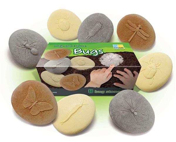 8 dubbelzijdige stenen met (voet)afdrukken - insecten (afm. 9 x 6 cm) Kever, vlinder, duizendpoot, libel, lieveheersbeestje, spin, pissebed en mier.