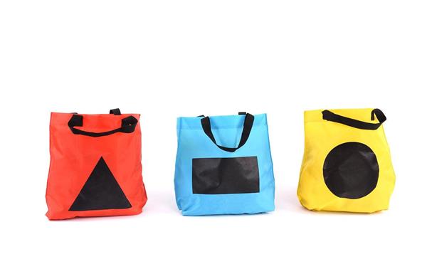 Een set van 4 zakken in 4 kleuren (groen, geel, rood en blauw) met aan één zijde een vorm (cirkel, vierkant, rechthoek of driehoek) en blanco aan de achterzijde. Gebruik de zakken om te sorteren op vorm of kleur. Kinderen zullen dol zijn op het vinden van voorwerpen om in hun tassen te stoppen. Elke tas is voorzien van een handig handvat. Enkel op bestelling.
