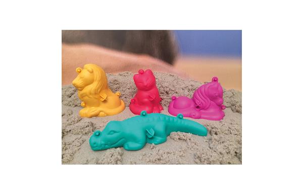 4-delige set 3D-zandvormen: 1 kat (afm. 6 x 7 x 8 cm) 1 pony (afm. 10 x 5,5 x 6 cm) 1 leeuw (afm. 8 x 6,5 x 9 cm) 1 krokodil (afm. 16 x 5,5 x 3 cm)